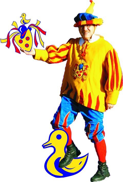 Nun historisch korrekt zeigt unser „Ritter Haugg“ einen reichen Edelmann in Waffenrock. Er verkörpert die Familie der Hack von Hoheneck und trägt daher deren Familienwappen im Original sowohl auf dem Waffenrock, wie auf seinem Umhang. Das Schwert als Zeichen seiner Ritterwürde darf natürlich nicht fehlen.