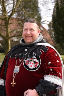 Nun historisch korrekt zeigt unser „Ritter Haugg“ einen reichen Edelmann in Waffenrock. Er verkörpert die Familie der Hack von Hoheneck und trägt daher deren Familienwappen im Original sowohl auf dem Waffenrock, wie auf seinem Umhang. Das Schwert als Zeichen seiner Ritterwürde darf natürlich nicht fehlen.